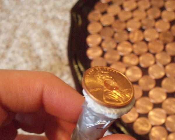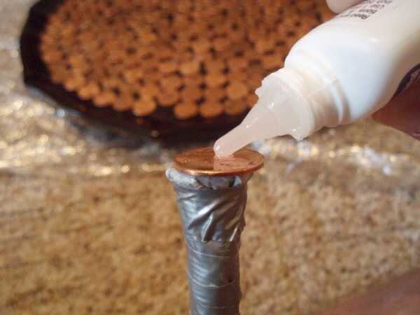 -Ahora, para esta parte, he hecho una herramienta improvisados para recoger cada penique y pegamento uno por uno. Use un lápiz con una moneda adherida con cinta al final de la misma. Conducto de cinta funciona bien, o puede utilizar pinzas,. Usar algo para pegar cada centavo abajo, si tiene sentido lo que estoy hablando mirando las fotos.