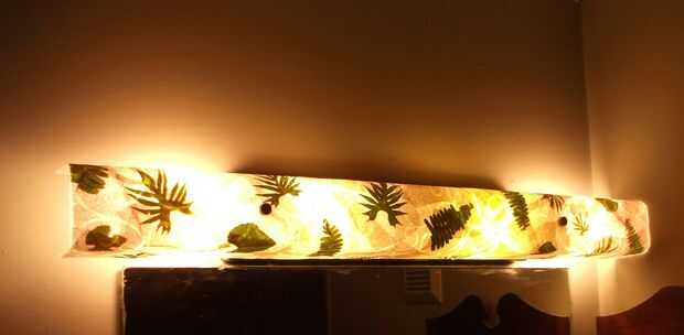 .. .y por supuesto la lámpara de cuarto de baño. ¿Muchos de ustedes han visto esta exacta vidrio cubierta en su propio cuarto de baño, bastante estándar cuando se construyen algunos de estos condo/apartments...frosted de vidrio con un patrón de remolino "transparente"? Ahora no voy a decir es horrible, pero nos gusta un aspecto más orgánico y tierra en nuestro hogar, además tendemos a ser frugal con los gastos.
