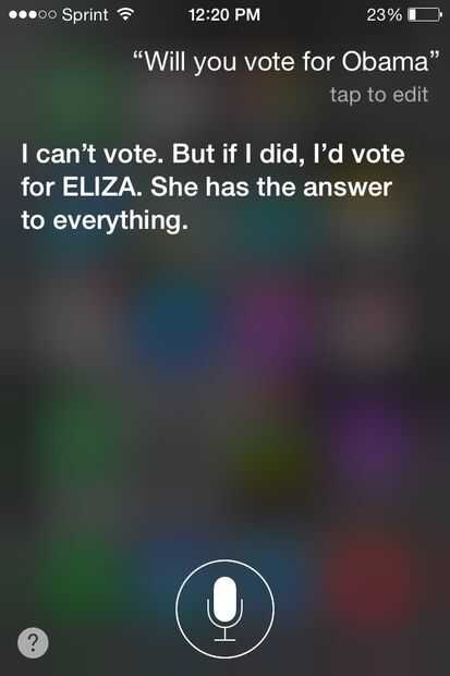 Está bien. Siri le encanta a ELIZA, aunque nadie sabe quién es ella, pero sus respuestas las preguntas anteriores son graciosos sin embargo.