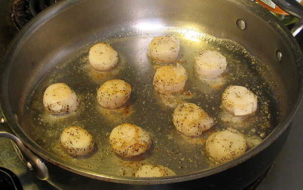 Tan pronto como usted comienza a ver el dorado en la parte inferior de las vieiras, rápidamente les tapa todo. Esto realmente debe tomar alrededor de un minuto por cada lado, máximo.