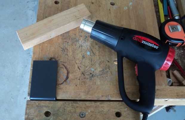Tengo una fuente de plástico ABS en mano que cosechan de antiguos canales de televisión Analizador-regenerador, aserrado a los pisos y formas que creo que pueden tener algún uso futuro. Es fácilmente trabajada a máquina y trabajó con las herramientas ordinarias y por supuesto, gratis. Simplemente determina el ancho deseado y cortar mi pieza lo suficiente como para tomar un grado 90 curva y cubrir dos aberturas adyacentes. Una configuración simple en la mordaza, una pistola de calor y un bloque de madera para presionar el trabajo plana resultó en una pieza de adorno aspecto decente, en espera de la perforación de los agujeros de montaje