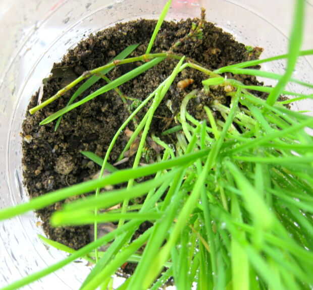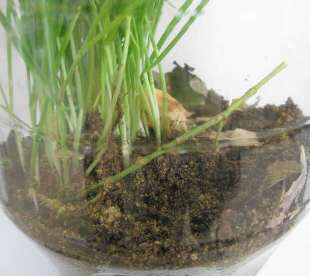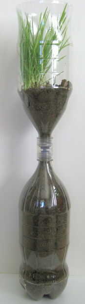 Llene la botella de 2 litros superior de algunos suelos (hasta donde la botella se ensancha a su diámetro más grande). Entonces, si lo desea, puede añadir algunas semillas de hierba/grass, hojas pequeñas, rocas, ramas, etc., para hacer una zona natural de forrajeo para las hormigas. También se debe añadir un poco de agua ya que las hormigas prefieren suelo semi-húmedo.