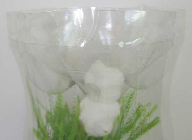 Esto deberá sellar la parte superior de la granja de hormiga bastante bien, pero si estás preocupada por escapar de las hormigas, haga lo siguiente: usa el cuchillo para hacer orificio en la parte superior (tal como en uno de los cinco golpes), empujar una bola de algodón en el agujero (por lo que las hormigas conseguir aire fresco y filtrado) y luego sellar la parte inferior sobre el frasco con cinta de embalaje.