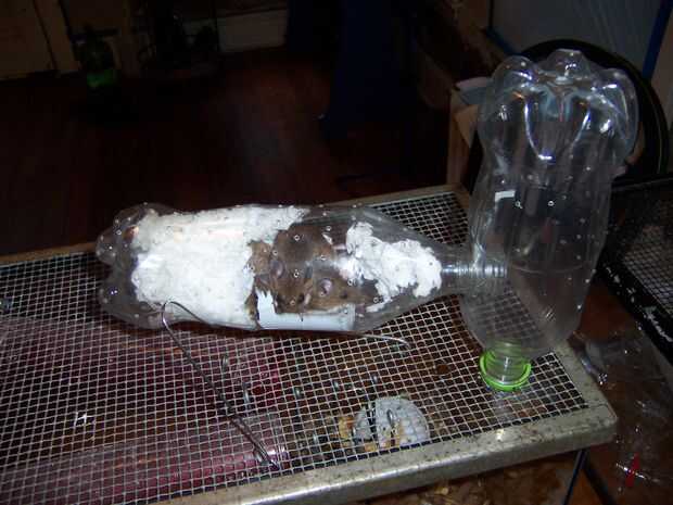 Vuelva a colocar la botella abierta con una botella. Fundir sobre un centenar de agujeros en la botella con un pincho que se calientan en una llama de vela o la llama del quemador de alcohol. Añadir un par de hojas de papel de tejido, y el apartamento pent-mouse en el cielo está listo para ocupación.