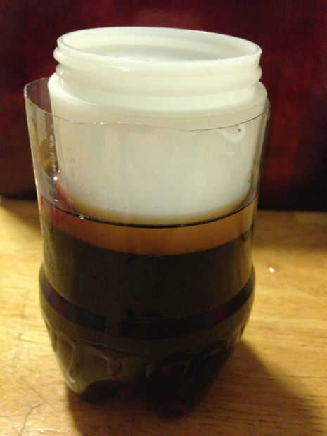Llenar las dos mitades con soda dejando espacio para los frascos. Esto no tiene que ser exacta pero no quiere dejar demasiado espacio en la botella o de lo contrario no se verá real. Asegúrese de que al llenar la parte superior de la botella que uses algo para mantenerla firme, que mina coloqué en un rollo de cinta que se quedó incluso. Usted puede encontrar que su tarro no encaja perfectamente en la botella, habrá algo de espacio extra a menos que usted es muy afortunado. Si esto sucede está bien sólo tendrá que hacer un poco de trabajo extra.
