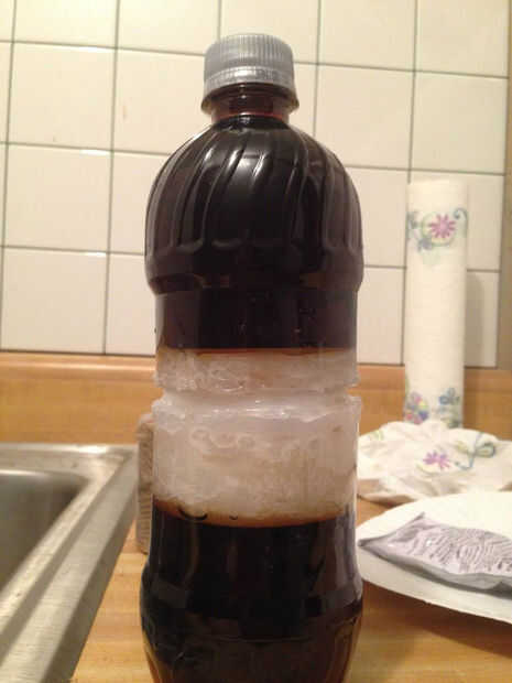 Una vez que esté seguro de que no hay fugas en sus frascos puedes poner los dos juntos. Asegúrese de que encajan muy bien, algun pegamento puede haber filtrado sobre y se obstruye la tapa. Retírela y asegúrese de que todo alinea uniformemente. Si tu botella es torcida hay realmente nada que hacer respecto a este punto. Uso pegamento de Elmer de regular o un palillo del pegamento para pegar la etiqueta de nuevo. SÓLO pegar la etiqueta en la parte superior de la botella. Si pega en la parte superior e inferior no podrás abrir el frasco.
