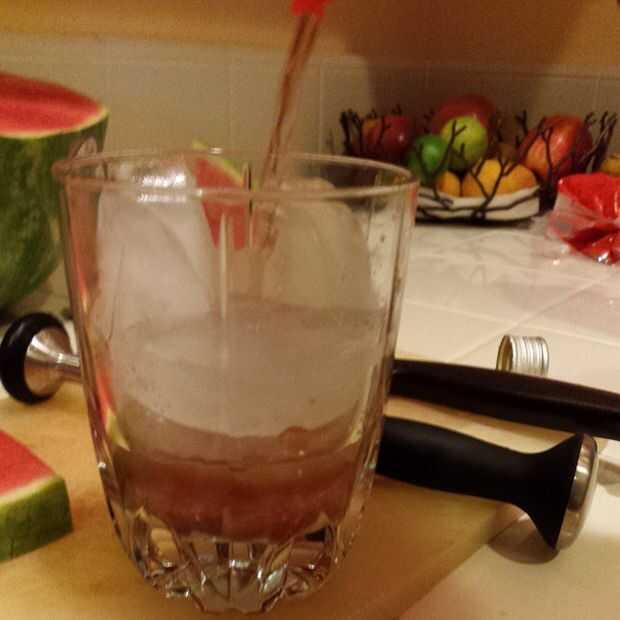 Vierta 1.5oz. de fresa y albahaca había infundido gin. Instructivo para la fresa y albahaca Ginebra aquí.