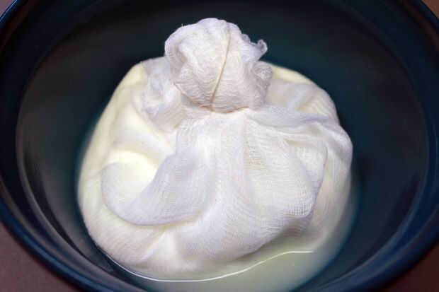 Línea de un recipiente con unas pocas capas de estopilla y desembocan algunos yogurt. Una tina de 32 onzas de yogur de Nancy rinde aproximadamente 2 tazas de suero de leche. Su paquete del yogur de cerca y suspender por lo que el suero de leche puede gotear libremente. Si su recipiente es lo suficientemente profundo, puede poner una cuchara de madera y atar la estopilla saco a la cuchara.