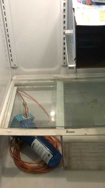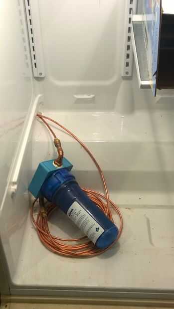 Nuestra nevera normal tiene hielo, pero no agua. El refrigerador de la cerveza está en el sótano por debajo del fregadero de la cocina. Taladré un agujero de 3/4" por el lado de la nevera. Roscado en la tubería de agua antes del descalcificador y funcionó una línea de cobre de 1/4" a la nevera de cerveza luego al fregadero. Originalmente era solamente la bobina, pero el volumen de agua fría en la línea era pequeño. Añadí el filtro de carbón para usar como reservorio.
