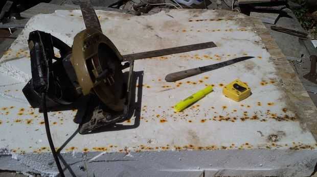 Estas son las herramientas que pensé tendría: una cinta métrica, regla, Plaza, marcador de fieltro, cuchillo largo o sonda, una sierra, usé sierra circular con un disco abrasivo. Yo habría utilizado una sierra de mesa con una cerca o un cortador de alambre caliente. Otras sierras son demasiado sucios. incluso en esta escala de planificación ayuda a