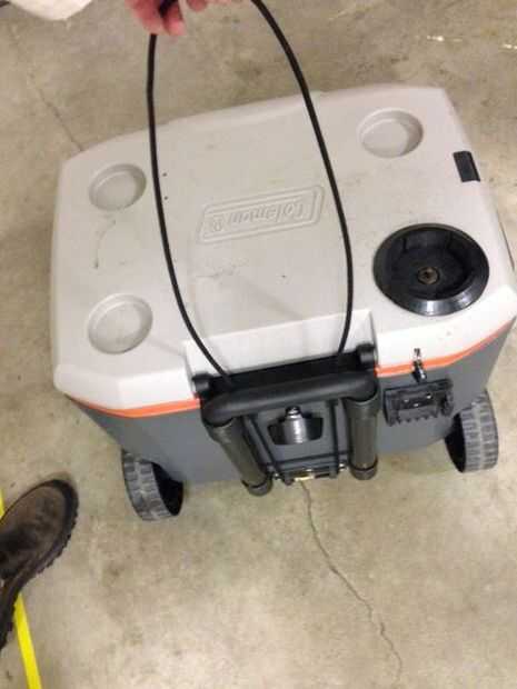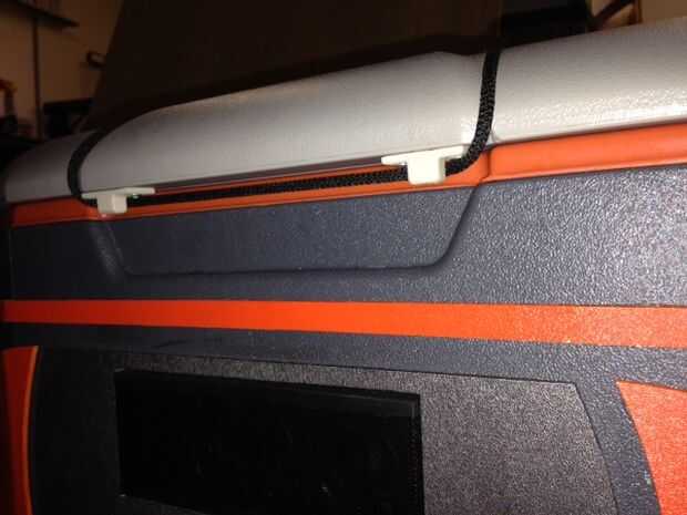 He modificado mi Cool para llevar mi equipo extra a y desde mi coche a mi evento al aire libre. El amarre es un bucle de 3/16" bungee cordón que envuelve alrededor de la manija de mi refrigerador cuando no esté en uso, pero bloqueos hacia abajo a través de un conjunto de calas de almeja del choque.