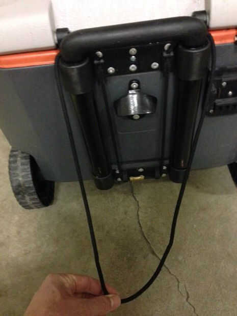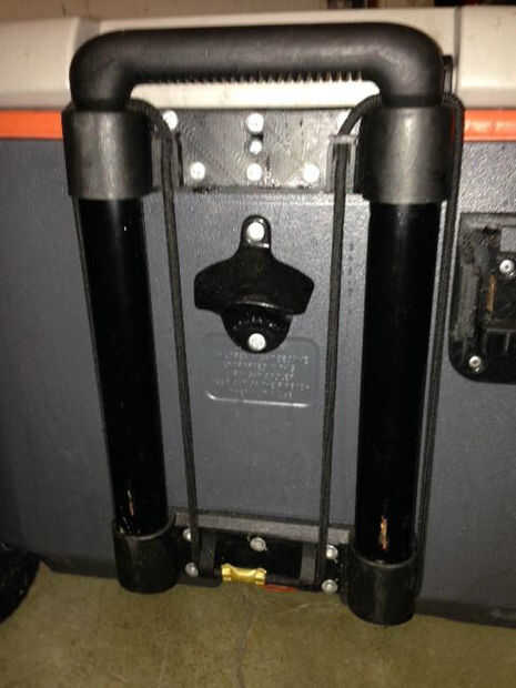 En primer lugar, usted necesitará perforar y pop-remache de la ' clam cleat ' y el soporte del cordón en la parte trasera de su refrigerador entre el mango. Probablemente fue por la borda con los remaches pop, pero son tan eficientes y divertidos!
