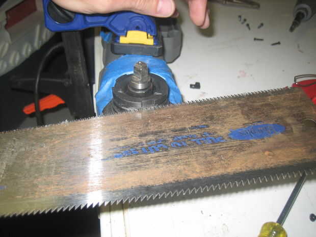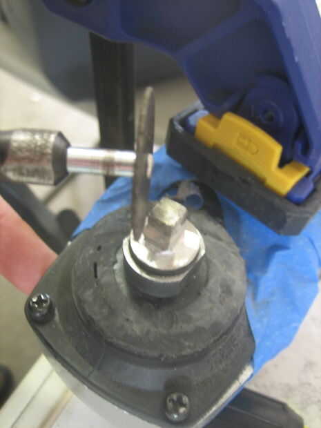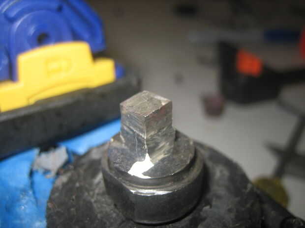 El eje de salida de la amoladora es una varilla roscada. Tenemos que hacer un eje cuadrado XXX que encajen en la base de la jarra de la licuadora y eso hoja de la vuelta. Usé una amoladora con un disco de corte metal para realizar la cirugía. Esto era realmente más fácil de lo que esperaba. Marca el punto central y empezar a cortar los bordes de la varilla roscada en cortes iguales y paralelos. Encontré que era más fácil primero corte un eje cuadrado más grande, luego cuidadosamente la rutina un poco más de cada lado. Usé mis pinzas para asegurarse de que el ancho de un lado era el mismo que el otro. Mina son.238" de ancho.