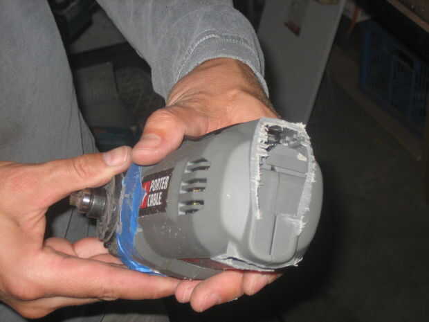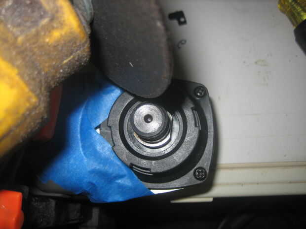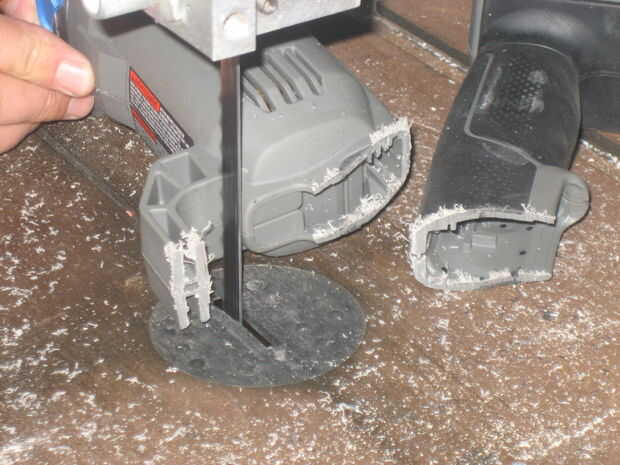 Para asegurarse de que nuestro eje puede alcanzar a través de la tapa de la hielera, tenemos que recortar distancia algunas de plástico alrededor del eje de la base. Por suerte la gente fina de Porter-Cable pone una línea que podemos ver o Dremel alrededor.