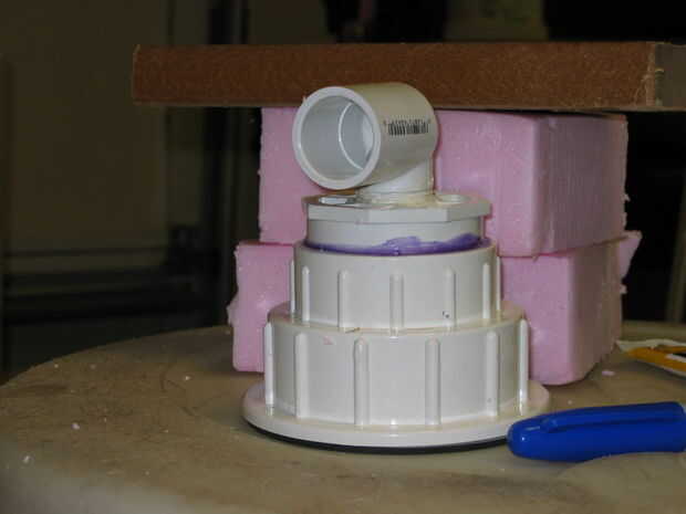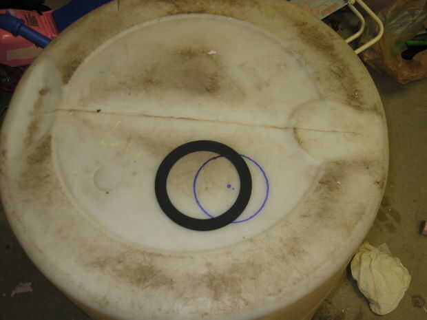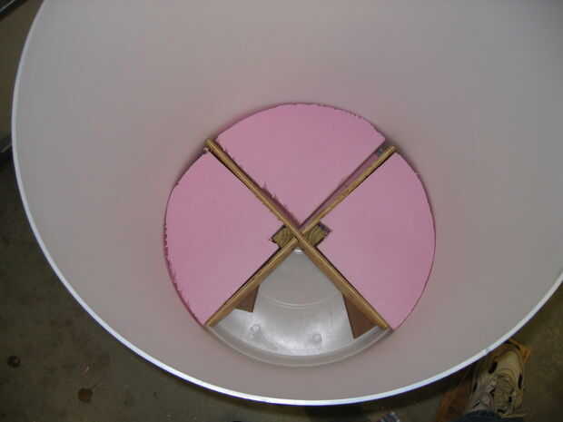 Revise tamaño y empezar a cortar el tablero de la espuma para adaptarse a los espacios entre los soportes. Una vez que todo se ve bien, poner el tambor pequeño dentro y marque el agujero para el drenaje. Monte el desagüe y comprobar todo para ajuste.