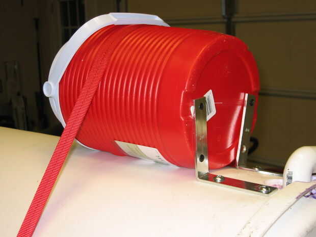 Cometí el error de no montar los soportes antes de que fuera demasiado tarde usar tornillos y arandelas. Como resultado, tuve que usar tarugos. De cualquier manera, el momento de montar el recipiente de 1 galón en el exterior para mantener el cartucho de CO2. Tornillo de la parte inferior de la jarra en los soportes y añadir una correa para asegurarse de que el recipiente será seguro.