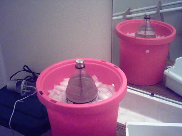 Se ha añadido una segunda bebida en una botella más pequeña a 100 grados F para ver los efectos en él. A 80 grados bastante rápido, puede estar afectando la botella más grande. Gran botella ahora sólo 50 grados. Sal agregada.