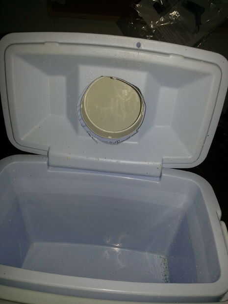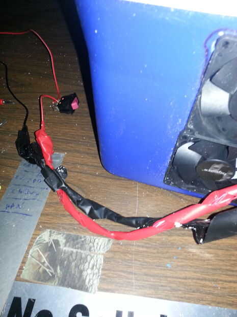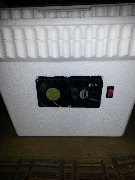 Primero hice un prototipo de una espuma de poliestireno más fresco. Simplemente localizar el entonces la salida de ventilación en la parte superior del refrigerador, utiliza una sierra caladora para cortar el agujero del tamaño correcto. Luego hice lo mismo con el ventilador de la C.C.. Me remonta en la parte frontal de la nevera luego utiliza un taladro para recortar un pequeño círculo para que pudiera ajustar la sierra caladora cortar.