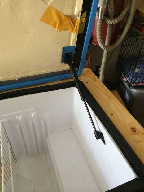 ordené esto de liftsupportsdepot.com. Cuando está completamente extendido lo es 12 pulgadas de largo y tiene una potencia de 35 libras. Pude hacer el montaje inferior en el lado de la mini nevera. Para la tapa tenía que cortar el aislamiento e inserta una madera de piece.of para más ayuda. Luego montar el soporte superior a esa junta y consiguió un resultado muy agradable.