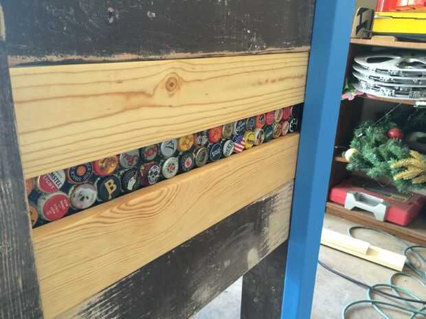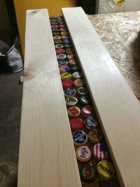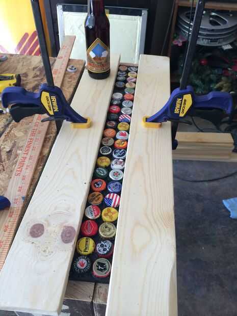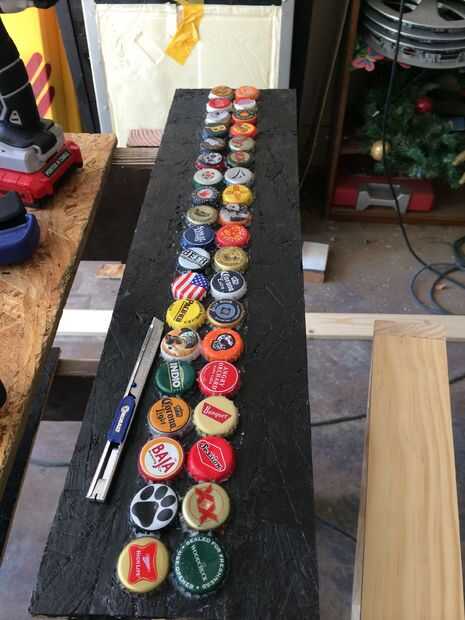 Para montar los tapones de botellas utilicé una pieza de madera contrachapada como el soporte. La madera de la capa es de 6 pulgadas por 28 para la parte delantera y 6 pulgadas por 23. He pintado de negro la madera contrachapada y luego montar los tapones de botellas con sellador de silicona negro. Funcionó muy bien! Entonces le di unas 5 capas de poliuretano, que tienen un gran acabado.