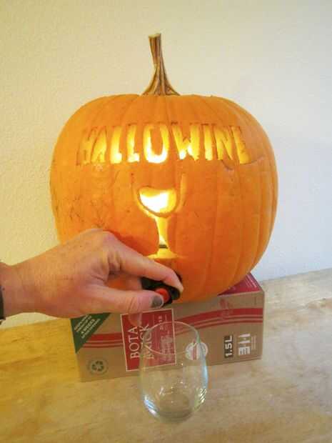 Vuelva a colocar la tapa de la calabaza. Levantar la calabaza (yo usé la caja de vino) o en el borde de un mostrador o mesa para de fácil acceso.