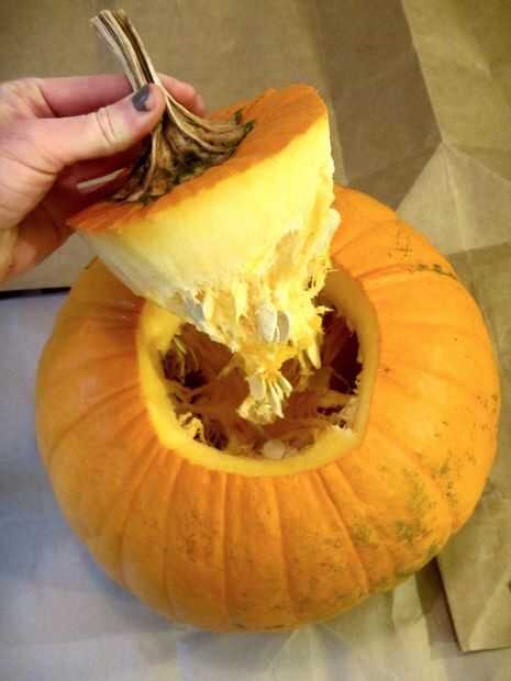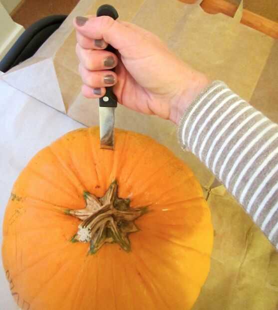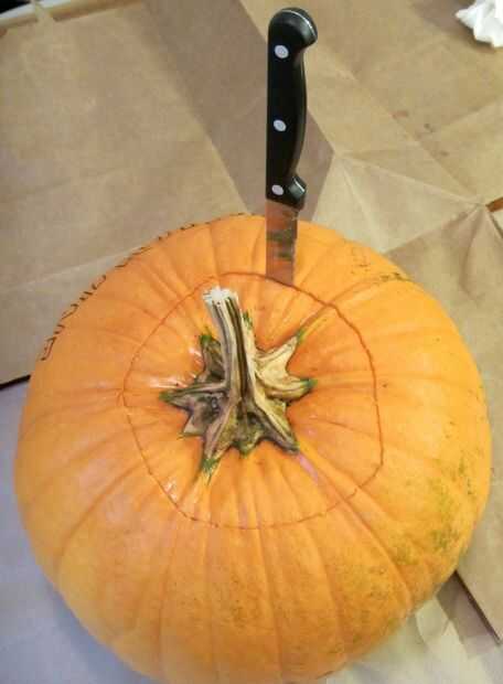 Inserte la herramienta de corte en la parte superior de la calabaza. Continuar en un círculo alrededor del tallo de la calabaza. Trate de mantener su cuchillo en un ángulo ligero con el mango de inclinación hacia fuera de la calabaza y la cuchilla de inclinación interior hacia el centro de la calabaza. Esto permitirá que la parte superior de la calabaza para ser afilados y sí mismo de la cuña en la calabaza en lugar de caer dentro.