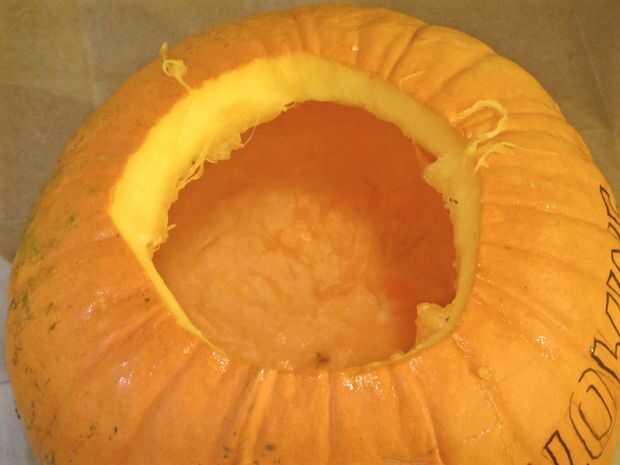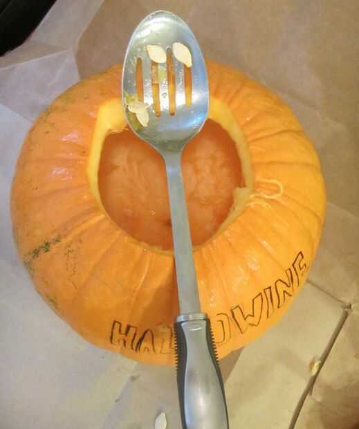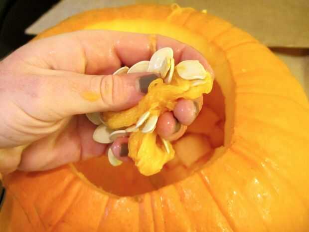 Usando las manos o un cuchara de metal grande quitar hebras de la calabaza las semillas y el interior. Raspe el interior de la calabaza con la cuchara de metal para asegurar que todas las hebras de calabaza se han quitado.