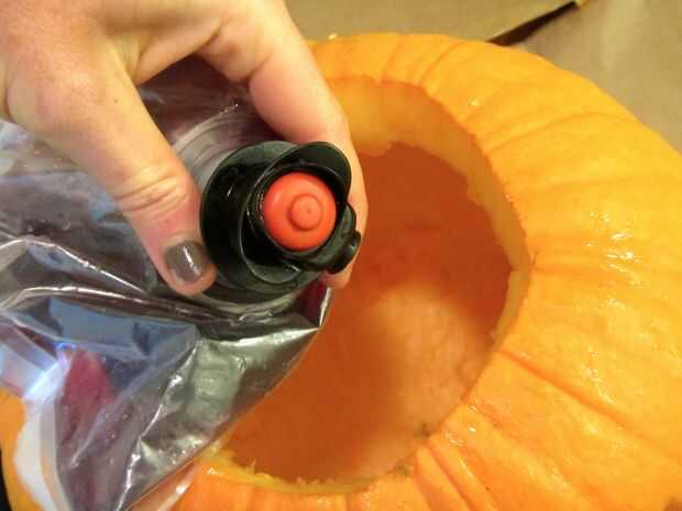 La bolsa del vino en la base del pico, coloque su bolsa de vino dentro de la calabaza y empuje la boquilla a través de su orificio en la base. Si el agujero no es lo suficientemente grande, será evidente. Si este es el caso, retire la bolsa de vino y agrandar el agujero con sus herramientas de talla. Tratar de introducir la bolsa del vino y el pico otra vez.