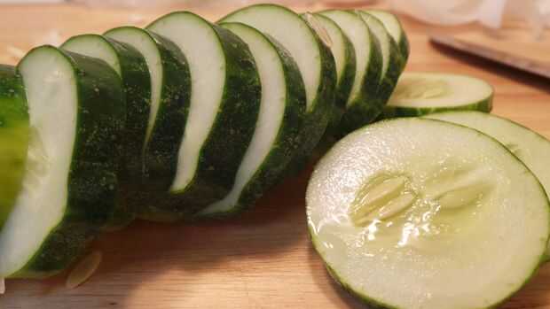 Luego rodajas de pepinos de tamaño mediano unos 7 a sobre 1/8 de pulgada de espesor. Necesitamos invertir en una mandolina!