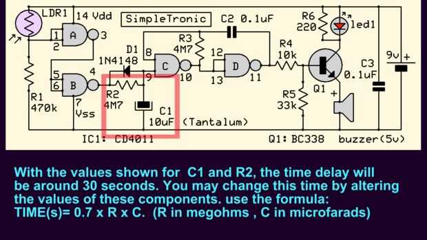 Mayor o menor retraso, utilice la fórmula tiempo (segundos) = 0.7 x R x C(R en megohmios, C en microfaradios)