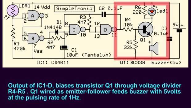 Mi objetivo era tener un indicador visual en la pared interior que mostraba que la puerta del garaje estaba abierta durante el día y una vez que lo oscuro fuera un audible para indicar que se había quedado abierta. Usé un circuito simple utilizando d