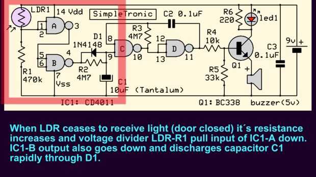 Mi objetivo era tener un indicador visual en la pared interior que mostraba que la puerta del garaje estaba abierta durante el día y una vez que lo oscuro fuera un audible para indicar que se había quedado abierta. Usé un circuito simple utilizando d