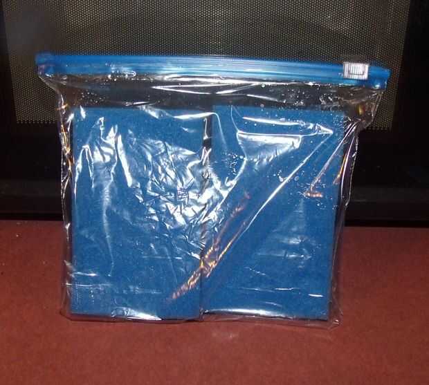 tomar una o dos esponjas y conseguir mojado, sacar hacia fuera la mayoría del agua, quieren mojado y todo pero no goteando, colocar las esponjas en la bolsa de plástico y pegarlas en el congelador