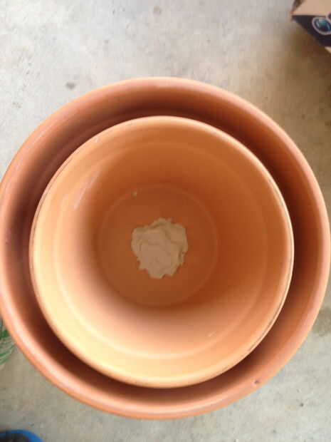 Llene la olla más grande con una capa de arena.  Luego poner la olla más pequeña dentro de la más grande y nivelar la arena hasta que ambas macetas en altura incluso.