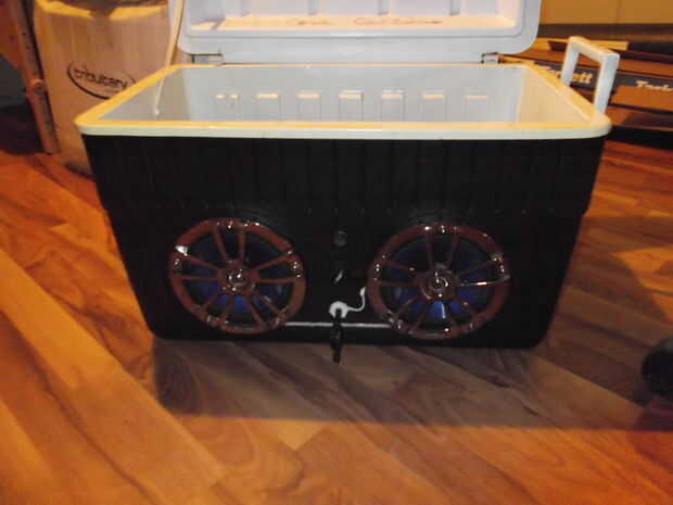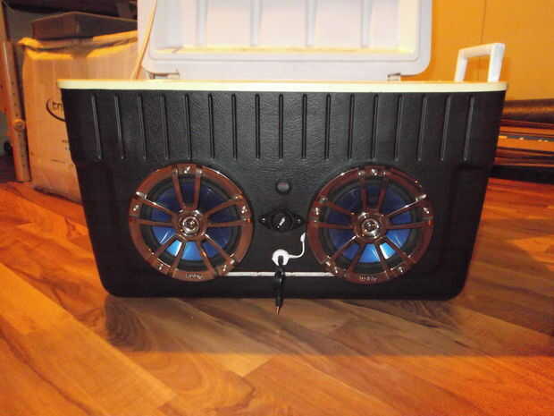 Una vez vi a un tailgater compañeros con un radio interior de una hielera. Pensé que esto era genio. Es ruidoso, barato y extremadamente portátil. Mi generación fue creado en base a los numerosos tutoriales que miré en Internet, además con mis propias ideas. (Pido disculpas por la calidad de imagen pobre, mi cámara de teléfonos está agrietada y no puedo encontrar mi cámara normal)