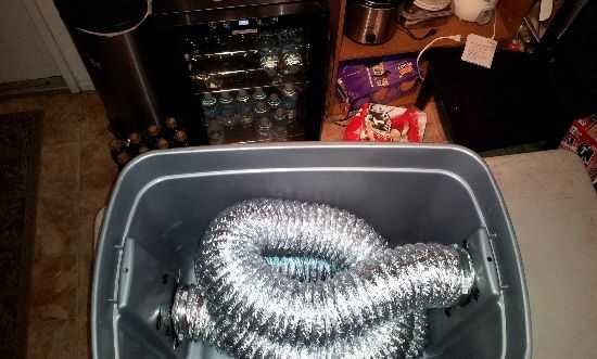 Luego instalé la secadora manguera en ambos extremos de la bañera. Tuve que usar abrazaderas para fijar la manguera de 4" a 3" PVC. (No tienen secadora manguera de 3"). Corté unas hendiduras de la manguera para que se ajuste más. Para enfriar la niebla yo simplemente llene la bañera con hielo, para bajar entre la manguera y se puedan esparcir uniformemente la cobertura máxima aire frío. Entonces como la niebla pasa a través del tubo se obtiene enfriado considerablemente.