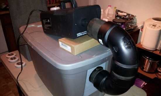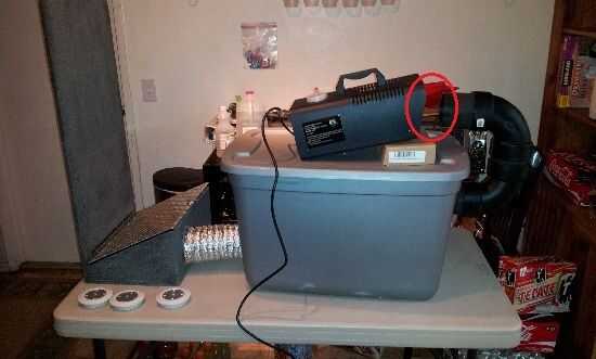 Luego improvisó varias piezas de PVC para crear la entrada de la máquina de la niebla. No pegar las piezas juntas para que pudiera tenerse para almacenamiento. También usé un pedazo corto de tubo secador para conectar a la lápida. Es importante dejar un espacio de una o dos pulgadas entre la boquilla del nebulizador y el tubo de admisión, creando un vacío de aire para el chorro de humo se mezcle con lo que le a ampliar.