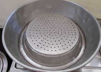 Ahora tome un colador metálico y colocarlo boca abajo en la sartén de fondo gruesa.