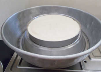Conseguir el agua a ebullición fuerte en el vapor y colocar una fuente para horno bien engrasada en él.