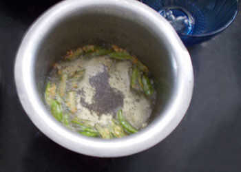Tomar una sartén con aceite y calentar bien. Añadir las semillas de mostaza y chiles verdes de la raja.