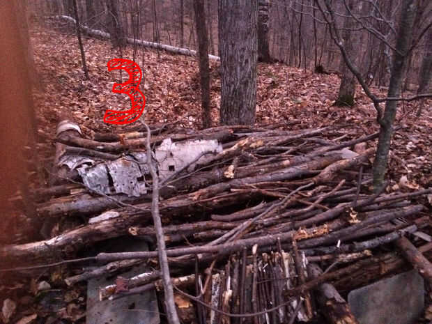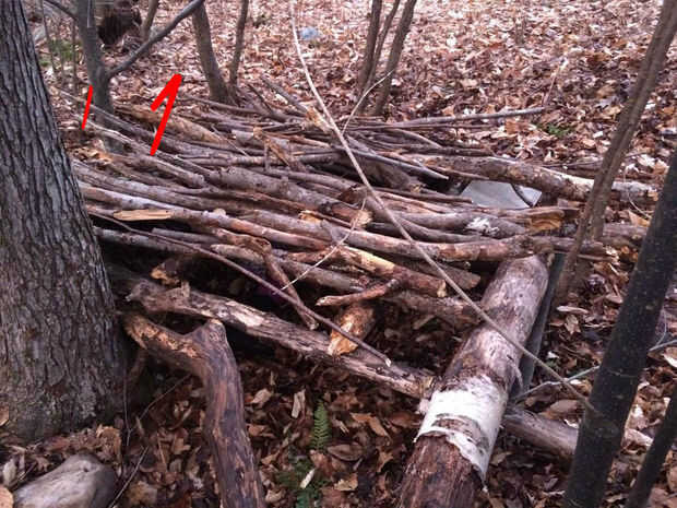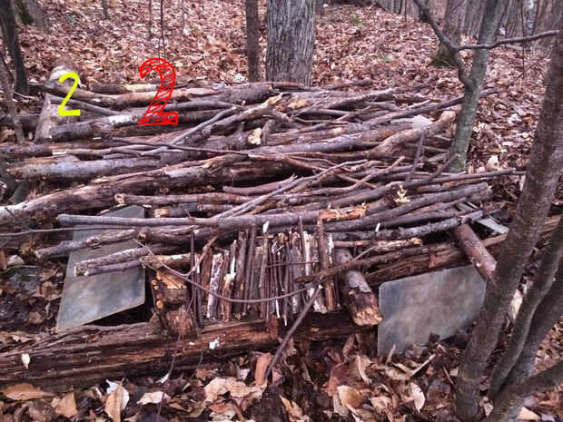Ahora debe buscar algunos-que como la primera foto de arriba (la imagen tenía en él a la imagen de la bruja). ¿Ver el registro grande cruzando uno de los primeros registros? Tiene abedul sobre ella. No tienes que hacer esto pero es más fuerte y más caliente si se rellena en el lado que tiene los agujeros más con un registro adicional. Para rellenar los agujeros en los lados más hice las losas de pizarra o poco palos (se muestra en la segunda foto). Incluso puede quite algunas ramas de pino para ayudar.