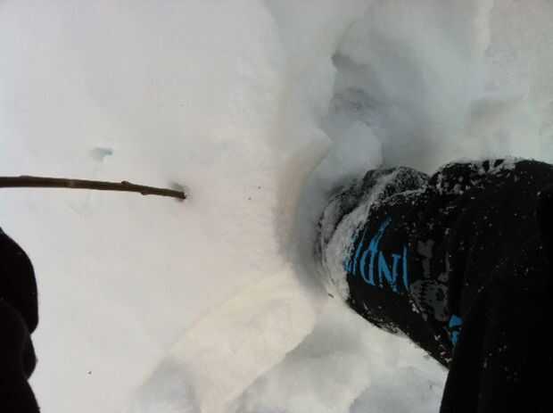 Las ramas se colocan en la nieve desde el exterior hacia dentro cuando usted cava desde dentro de ti no puede cavar demasiado delgada de las paredes. Estos coloqué cada 2 o 3 pies aparte señalando en el lugar se dig cubierta sobre 7 o 8 pies amplia en el exterior, en forma de cúpula que cubre la frente, lados de la parte superiores y traseras... La entrada debe ser en el lado con menos viento.