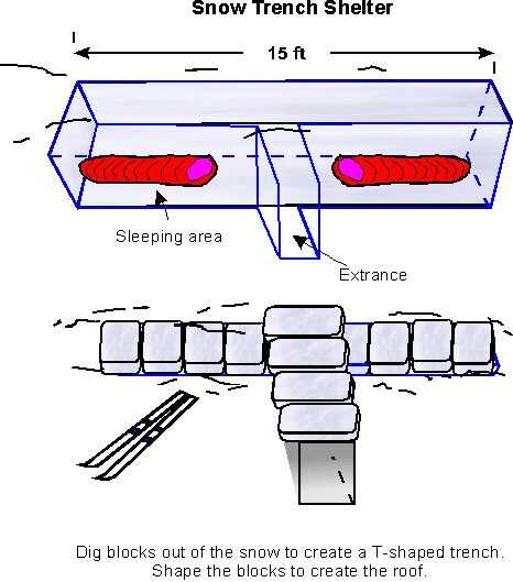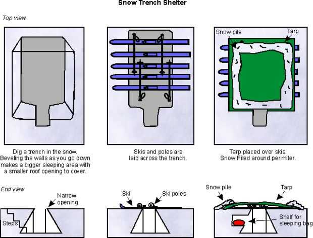 Esta estructura puede crearse cavando una zanja en la nieve a nivel del suelo (si es posible). La estructura debe tener un poco más de su cuerpo y 3-4 pies de ancho. Forre el fondo con material aislante que le aísle del frío suelo (en caso de emergencia puede utilizar 5-6 pulgadas de ramas de hoja perenne). Puede hacer un techo de esquís y postes o ramas superpuestas y cubiertas con una lona y luego suelta nieve o bloques de nieve paquete duro. La puerta será un túnel en el lado. Esto puede ser conectado con una puerta de nieve paquete duro. Un orificio de ventilación debe ser asomó en el techo para flujo de aire. Mantener un palo en este agujero y agitarlo cada cierto tiempo se mantenga el agujero abierto. Si es posible, la entrada debería ser inferior al nivel de la zanja, esto mantiene el aire más frío en la entrada y no en la trinchera.