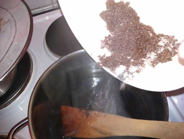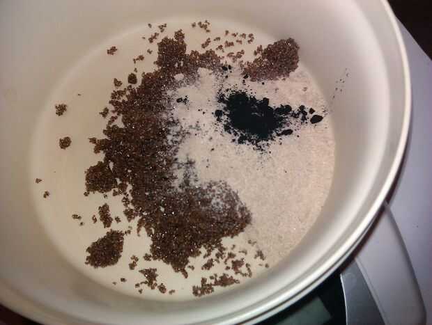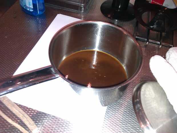 Paso 5: Añadir el azúcar, Salmiac y carbón activo. Remover y hervir para disolver. Hervir el extracto de a fuego lento, hasta que concentra a 70-80 ml de sirope negro. Mayor concentración dará un producto de sabor mucho más fuerte.