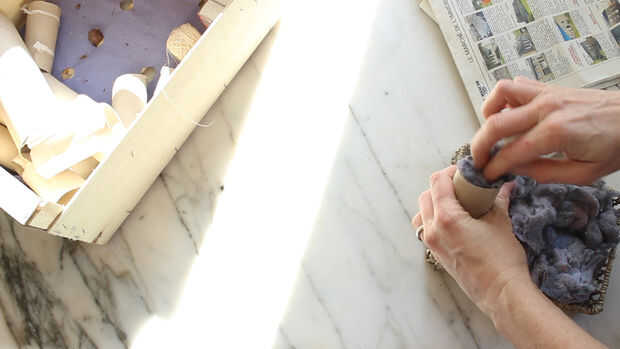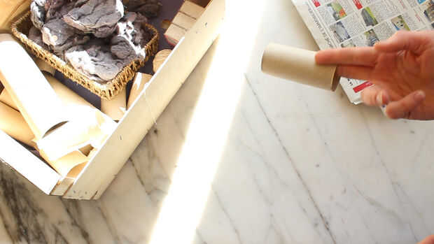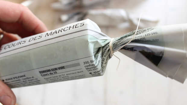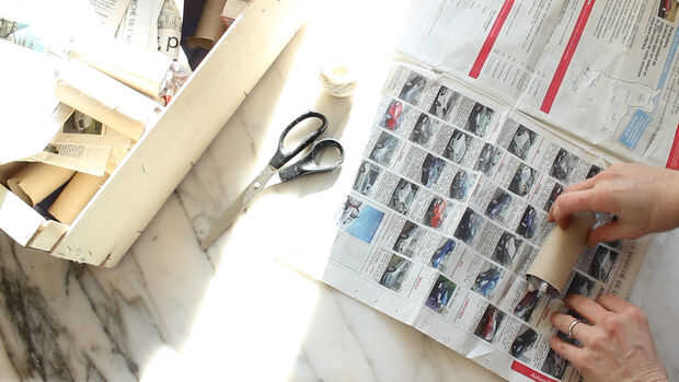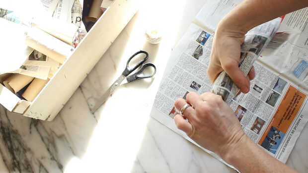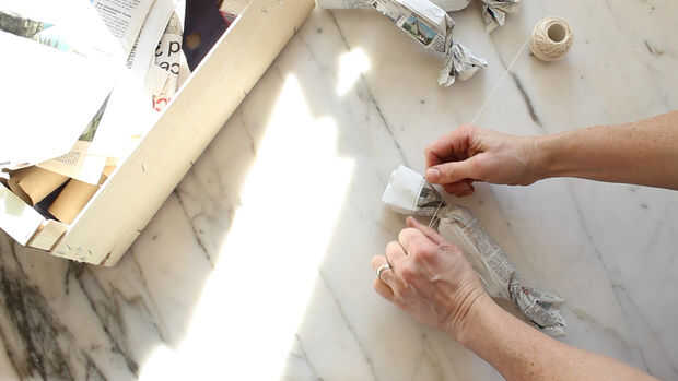 Rellenar los tubos de papel higiénico con la pelusa de la secadora. Ruede para arriba en el periódico, retuerza los extremos y atar con la cuerda.
