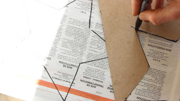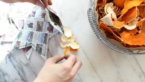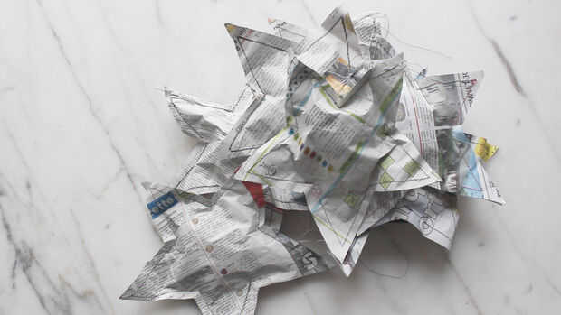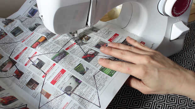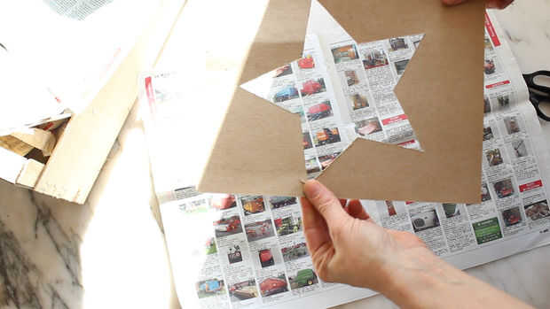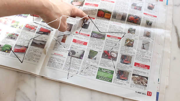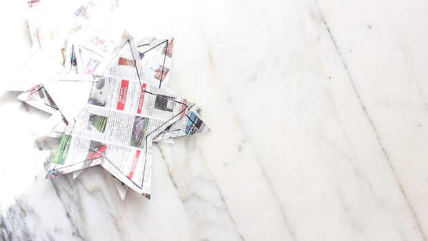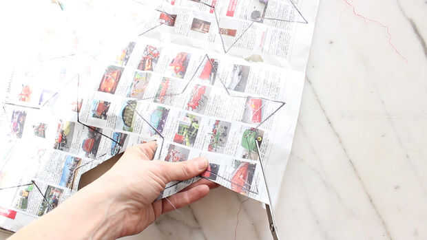 Ahora seguramente ya sabes que puedes hacer cualquier forma que te gusta. Traza forma en 4 capas de periódico. Coser todos los bordes de la forma asegurándose de dejar un lado abierto. Corte la forma de la estrella dejando un poco de un borde. Ahora la materia con sus cáscaras secas de naranja. Hablando de... Seco mi naranja tirándolos encima de la chimenea. Puede secar en el horno tan fácil. Una vez que se llena el formulario, puede terminar coser el resto de la forma.