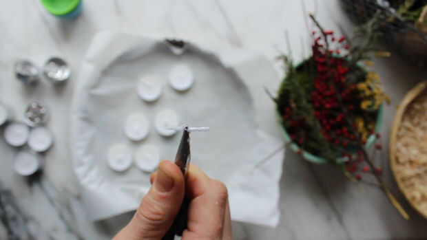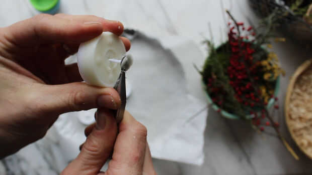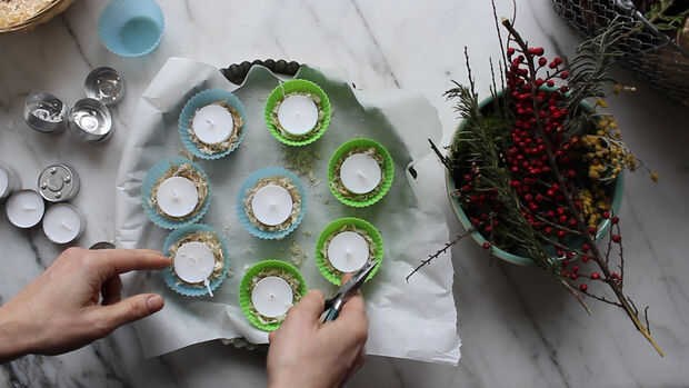Normalmente utilizaría para arriba todas las viejas velas encendidas en la casa por fusión y verter en los moldes. Estoy recién salido de la vieja velas y recurrido al uso de nuevas luces de té. Debe tomar las luces de té desde sus tazas de papel y coloque encima las virutas de madera. Utilizando sus pinzas, quite la pieza de metal de la parte inferior que sostiene la mecha. Luego, quite la mecha apretando el pequeño pedazo de metal. Coloque la mecha en los moldes de silicona con las velas. Ahora les derrite hacia abajo en un horno caliente.