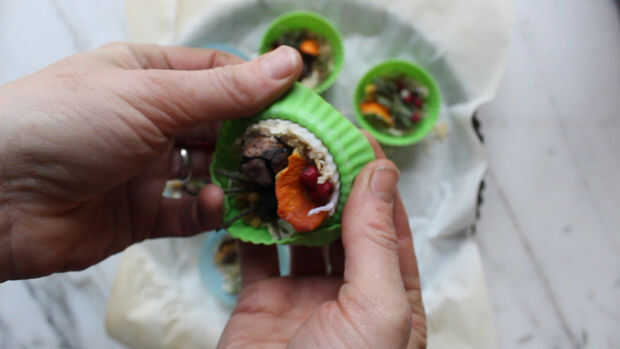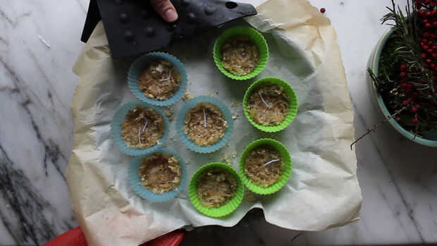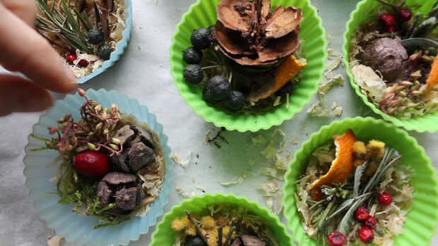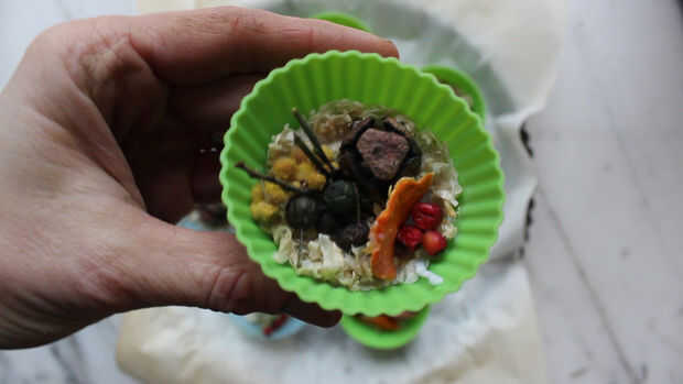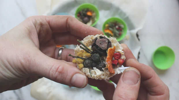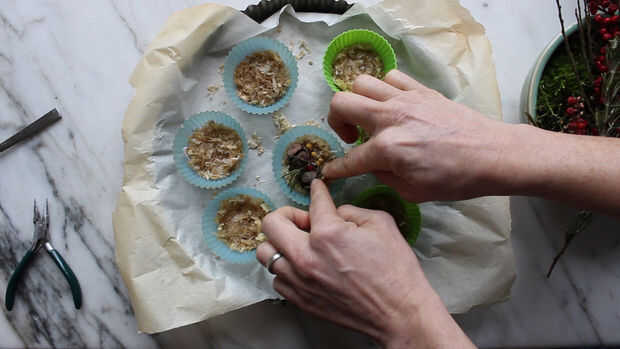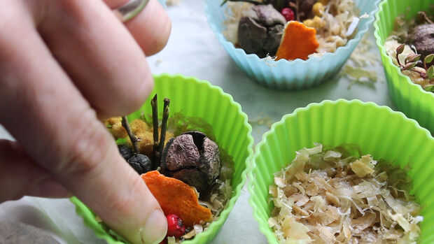 Una vez que la cera se ha derretido en todas las virutas de madera, tendrá que volver a colocar la mecha que encenderá fácil. El mejor lugar es en el borde del molde. Ahora usted puede empezar a añadir todas las pequeñas piñas y bayas al deseo de su corazón. No esta muy rápido ya que la cera se empezar a enfriar y solidificar. Más no creo! Empujar en tan rápido como sea posible. Una vez que la cera se seca, puede retirar de los moldes. TA-dah!