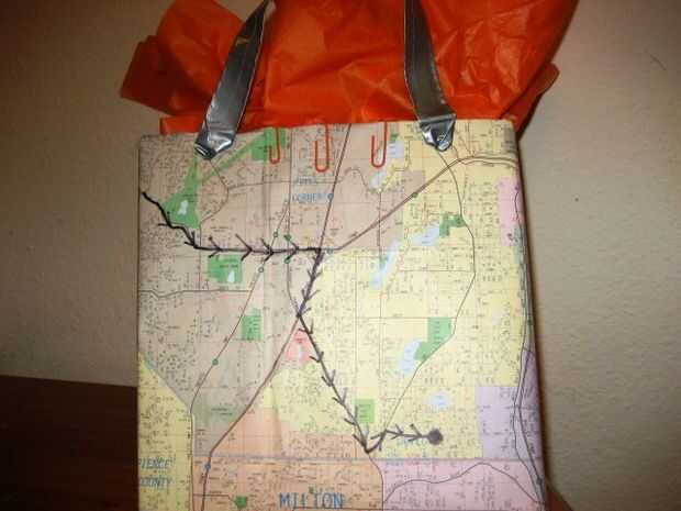 Este es un ejemplo de lo que un mapa, cinta adhesiva y clips de papel puede parecer como una bolsa de regalo. Trate de usar las tapas del catálogo de Cabela, armas y munición, campo y corriente, etc. para hacer bolsas de regalo se vea un poco más masculino.