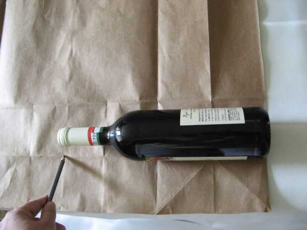 Alinee la parte inferior de la botella en un borde y marque la parte superior (el punto donde desea que la parte superior de la bolsa de la botella a ser). Usted puede hacer esto más largo que la botella si quieres.